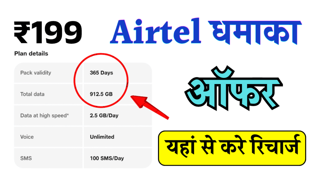 👉 अभी आवेदन करें Airtel Recharge Plan: दोस्तों अगर आप भी एयरटेल उपभोक्ता है और ऐसे में सबसे सस्ता रिचार्ज प्लान ढूंढ रहे हैं तो आपको बता दे की बहुत ही कम बजट में सस्ता प्लेन आपको देने वाले हैं जो बहुत ही फायदेमंद होने वाला है और यह प्लान सभी जगह पर बहुत ही … Continue reading Airtel का सबसे बड़ा धमाका ऑफर! 365 दिन की वैलिडिटी वाला प्लान सिर्फ ₹199 में, रोजाना 2.5GB 5G डाटा और अनलिमिटेड कॉलिंग के साथ